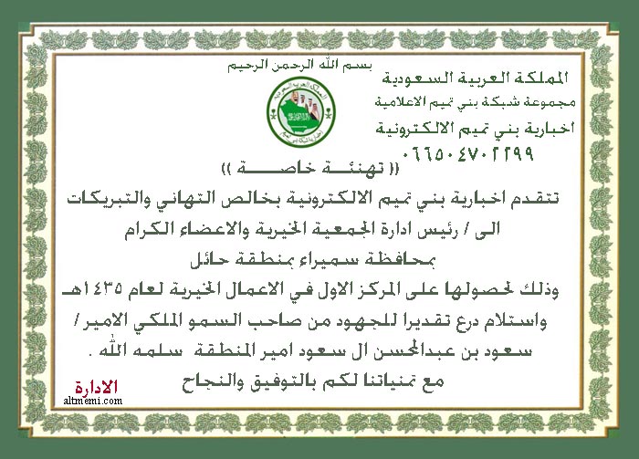 تتقدم اخبارية بني تميم الالكترونية بخالص التهاني والتبريكات الى رئيس الجمعية الخيرية في محافظة سميراء الاستاذ / سالم بن محمد الشبرمي , والى كافة اعضاء الجمعية الكرام وفقهم الله .