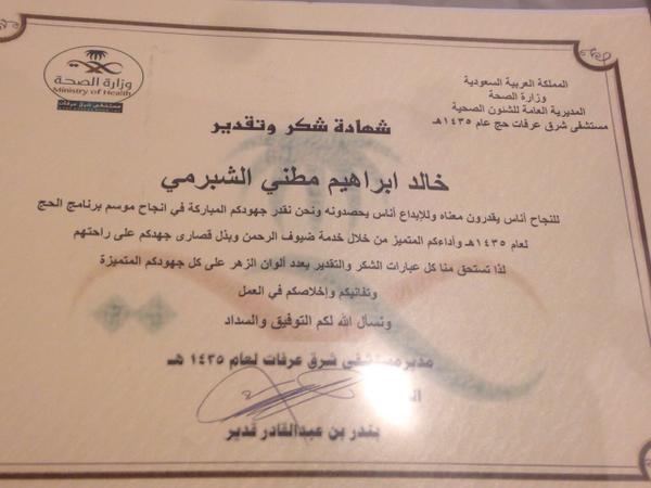 وذلك بمناسبة حصوله على خطاب شكر اثناء مشاركته في مهام الحج عام 1435هــ ( القطاع الصحي ) .