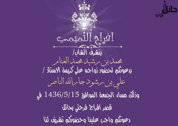 وذلك مساء الجمعة الموافق 1436/5/15هــ في قصر افراح فرحتي بحائل .